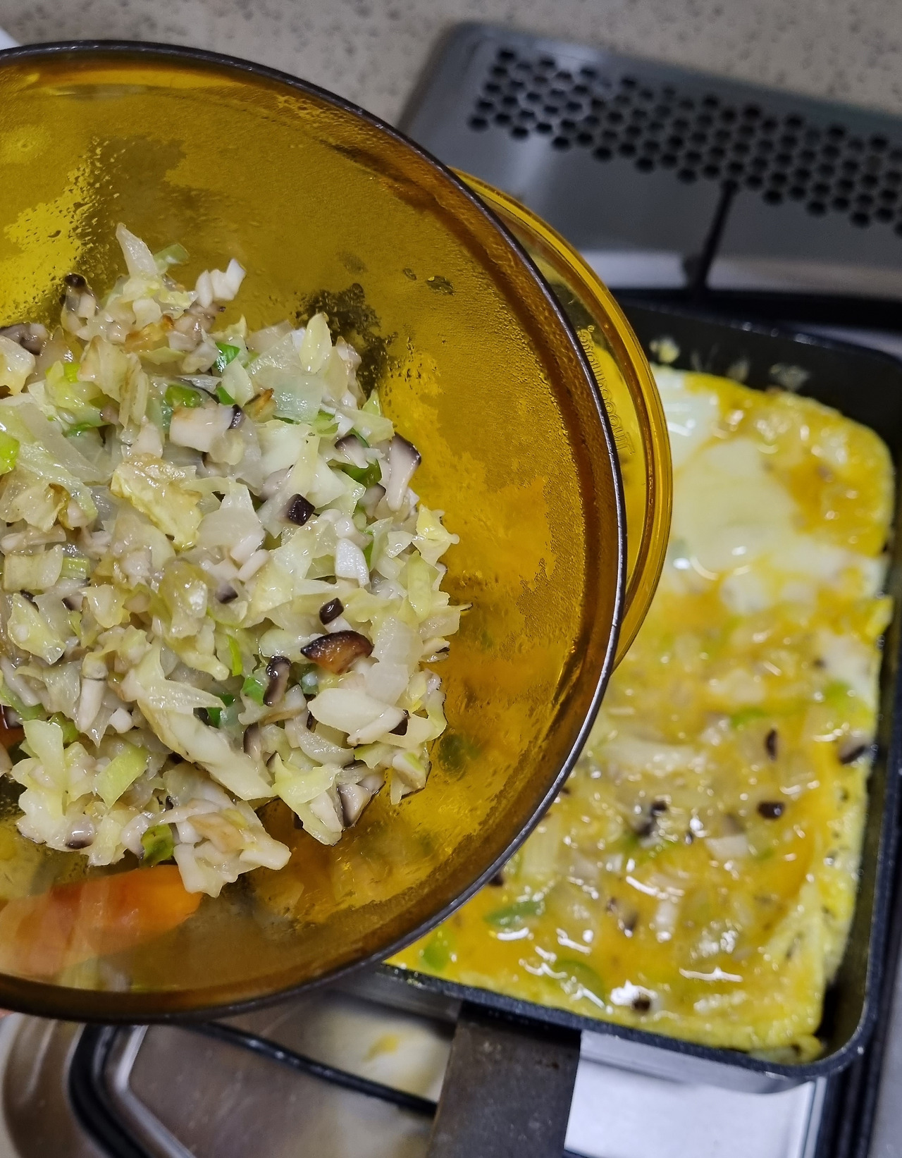 - 다진 야채를 계란물에 섞어 프라이팬에 부친다. 소금 간은 함께 먹을 치즈와 햄을 생각해 적당히 하거나 안 해도 무방하다.