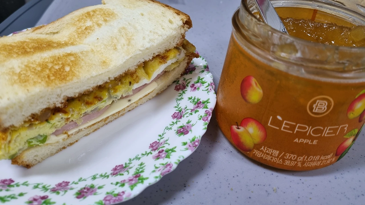- 좀 전에 부쳐낸 계란을 얹고 마지막으로 반대쪽 빵에 좋아하는 잼을 발라 덮어준다.