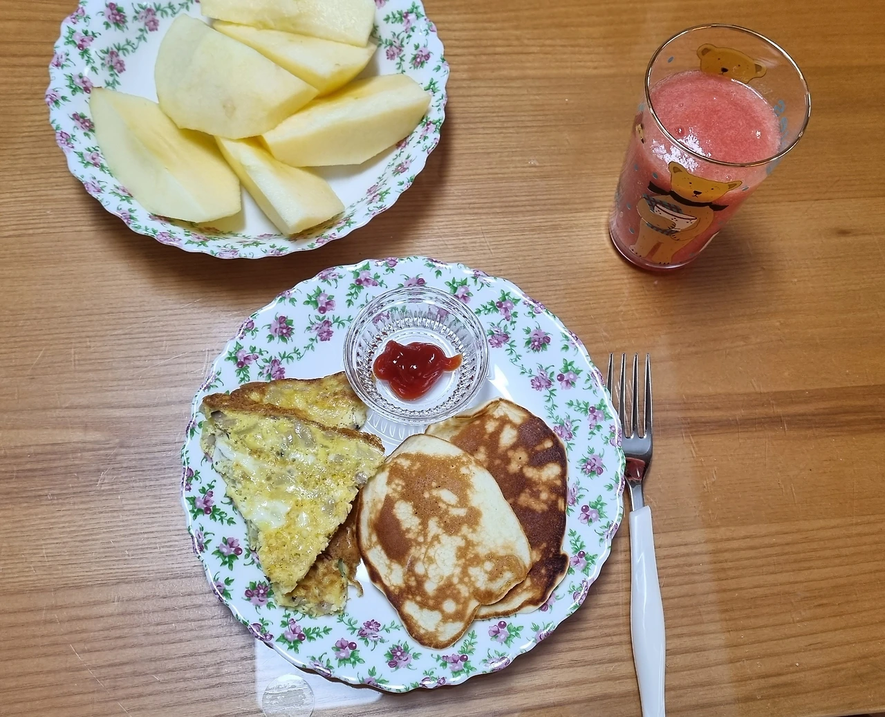 - 접시에 담아내고 펜케이크 위에는 꿀 살짝, 계란 전에는 케첩 조금은 함께 곁들인다.