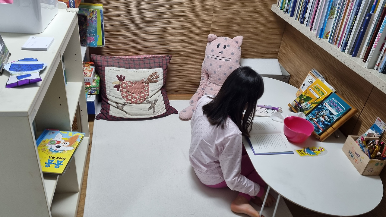 부엌 식탁을 거실 공용 테이블로 뺀 대신 그 자리를 아이들이 책읽고 그림그리는 공간으로 꾸며주었다.