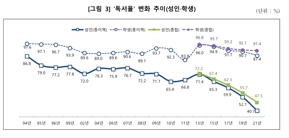 그래프를 보시면 독서인구가, 특히 종이책 독자가 2017년부터 급감해서 2021년에 40.7%를 기록하는 것이 보입니다. 종이책과 전자책, 오디오북을 합친 종합 독서인구 수치도 47.5%밖에 안 되네요.