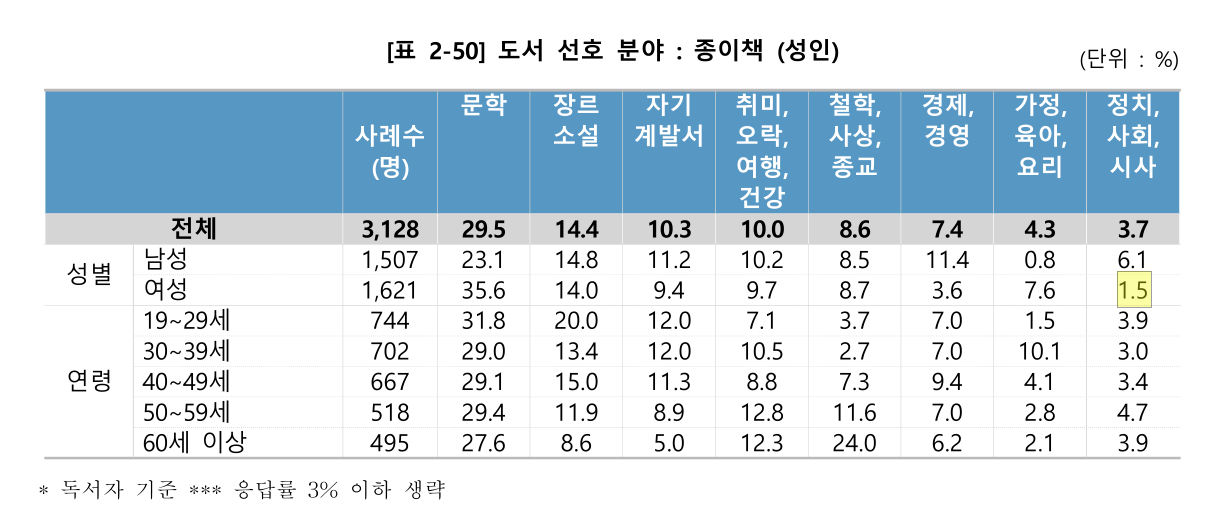 종합하면, 젊은 여성의 독서율이 낮지는 않습니다. 오히려 남성이나 중장년층보다 조금이라도 많이 읽습니다. 그러나 '두껍고' '(정치적인) 역사책'을 읽지는 않는 모양입니다. 통계에서 정치, 사회, 시사 부문의 도서 선호도가 남성은 6.1%인 반면, 여성은 1.5%에 그칩니다.