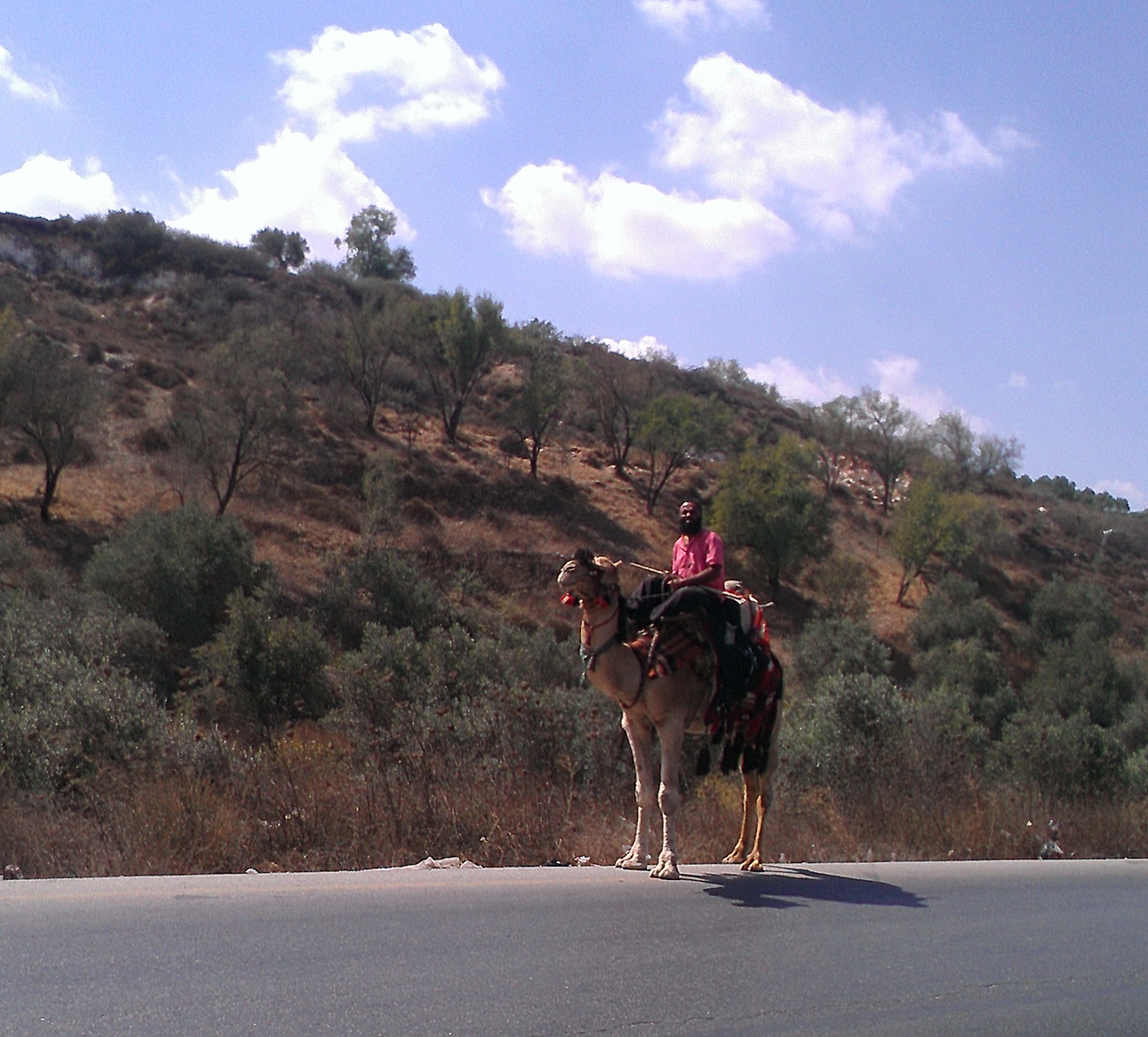 도보 여행은 오로지 주위 풍경만 보고 걷는 지루할 시간이 될 거라 생각했는데 의외로 재미난 일들이 있었다. 제닌을 빠져나오고 5분도 채 되지 않아 낙타를 탄 베두인(bedouin, 아랍 유목민)을 만난 것이 시작이었다. 그는 멀리서부터 환하게 웃으며 손을 흔들며 다가왔다. 낙타의 등에는 무언지 모를 배낭이 한가득 실려 있었는데 아마 제닌으로 가져가 팔 물건인 듯싶다. 도로에는 차들이 쌩쌩 지나가고 있는데 낙타를 타고 터벅터벅 움직이는 모습을 보고 있으니 기분이 묘했다.