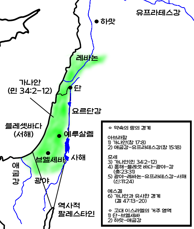 성경의 민수기 편은 모세가 약속받은 가나안 땅의 경계를 비교적 자세히 설명합니다. 이는 역사적 가나안의 범위와 유사하고, 유프라테스강으로부터 멀리 떨어져 있습니다.