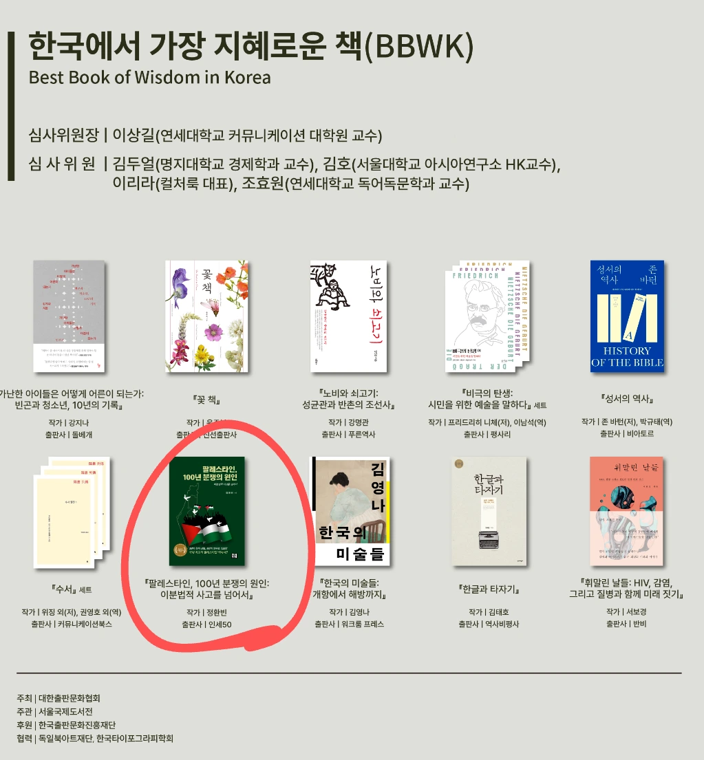 제가 쓴 '팔레스타인, 100년 분쟁의 원인 : 이분법적 사고를 넘어서'는 가장 지혜로운 책으로 선정되었습니다.
