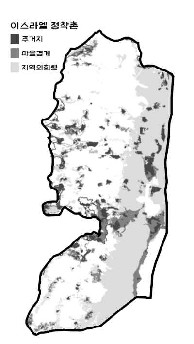 유엔은 당시부터 현재까지 서안과 가자지구를 팔레스타인인들의 영토로 정의하고 이스라엘의 지배를 인정하지 않습니다. 따라서 유대인 마을은 과거처럼 식민촌이라 부르는 게 옳지만, 서구 국가들은 앞에서만 비판하고 뒤에서는 이스라엘의 실효적 지배를 인정했기 때문에 정착촌이라는 용어를 받아들였습니다.