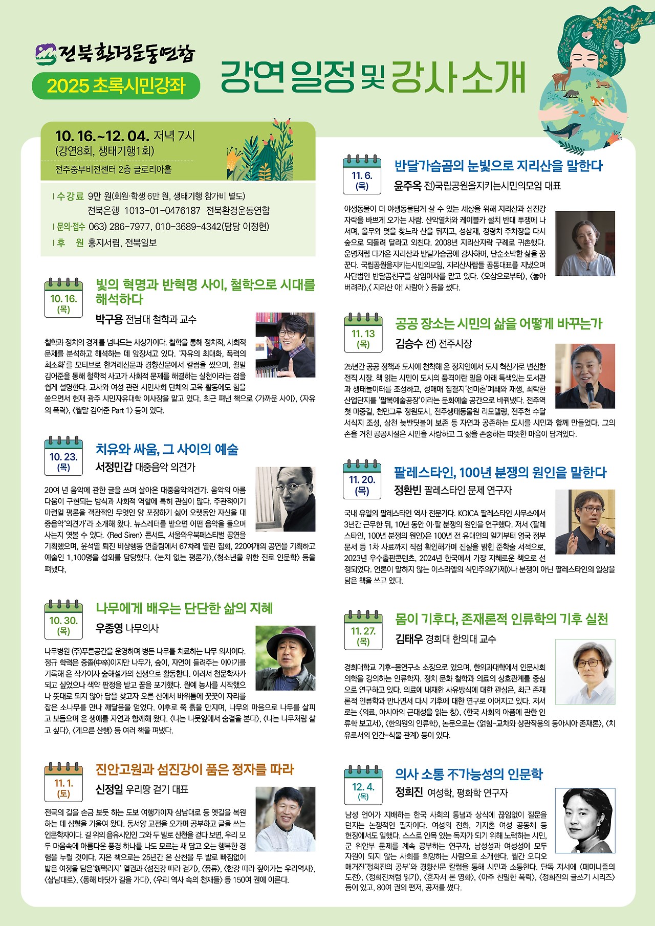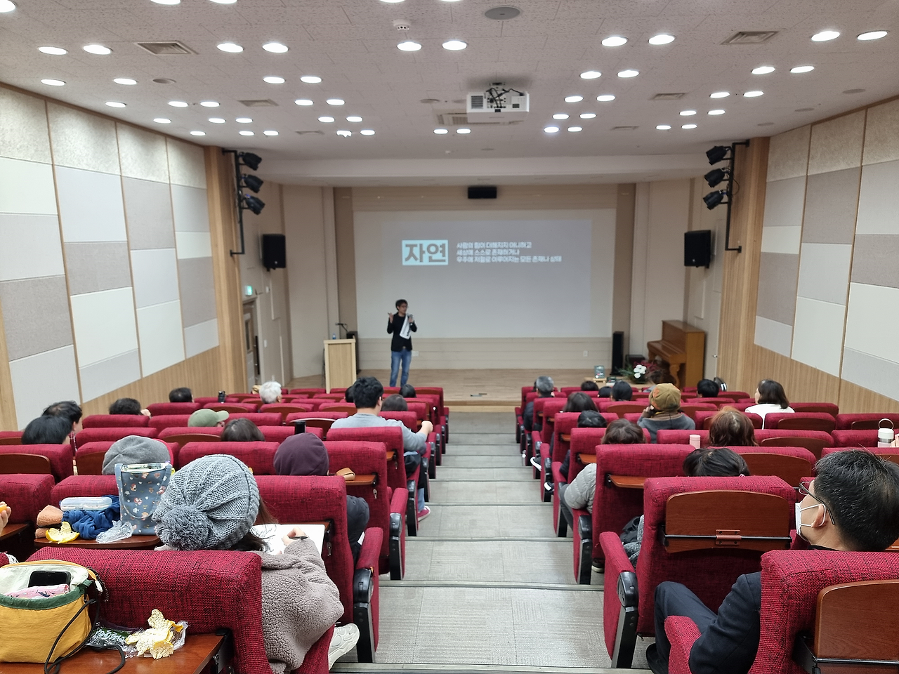 2025년 11월 20일에 열린 이번 강연은 전북환경운동연합에서 정기적으로 개설하는 '초록시민강좌'의 일부로 진행되었습니다. 다른 강좌는 인문학 분야라서 흥미롭고 가벼운 분위기인데, 저만 너무 무거운 주제라 반응이 안 좋으면 어떡하나 걱정도 했습니다. 다행히 2시간 내내 모든 분들이 집중해서 잘 들어주셔서 정말 보람찼습니다.