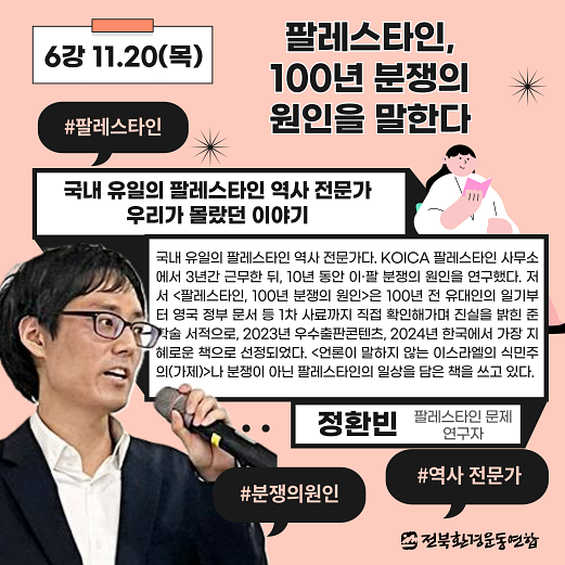 그러던 와중에 전북환경운동연합의 이정현 대표님으로부터 강연 요청을 받았습니다. 환경단체에서 연락을 주신 게 참으로 기쁘더군요. 해외에서는 환경단체들이 이-팔 분쟁을 위해 지속적으로 많은 노력을 해오고 있었습니다. 환경단체들의 궁극적 목표가 결국 생명을 지키는 것이고 반전 운동은 그 연장선에 있으니까요. 서구 국가들에서는 아무리 정부가 친이스라엘 성향이 강하더라도, 수많은 시민 단체들이 팔레스타인을 위해 목소리를 내고 있습니다. 그들은 우리처럼 분쟁이 어쩔 수 없이 생겼다거나, 혹은 쌍방잘못이라는 비역사적인 관념이 없기 때문입니다.