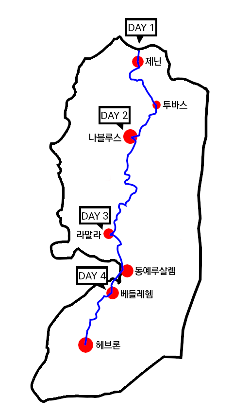 서안지구는 팔레스타인 국토의 94%를 차지하지만 제주도 면적의 3배밖에 되지 않는다. 다만 동서로 좁고 남북으로는 길게 뻗어 있어 130km에 달한다. [서울에서 대전까지의 직선거리가 140km다.] 실제로는 직선으로 걸을 수 없는 데다 고저 차가 심하니 걸어야 할 길은 훨씬 길어진다. 그래서 여정을 나흘로 잡았다. 북쪽 국경에서부터 출발해 주요 도시들을 거쳐 남부 최대도시인 헤브론(Hebron)에 도착하는 것이 목표다.