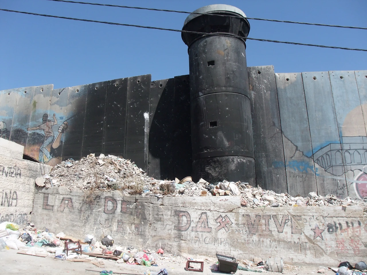 사진. 아이다(Aida) 난민촌에 인접한 분리장벽. 분노한 팔레스타인인들이 화염병을 던져 감시탑이 검게 변색되었다.