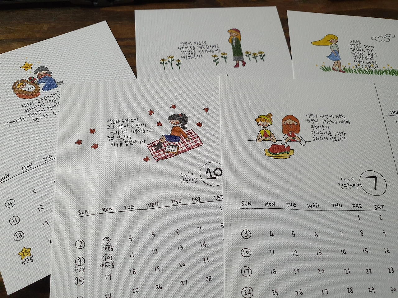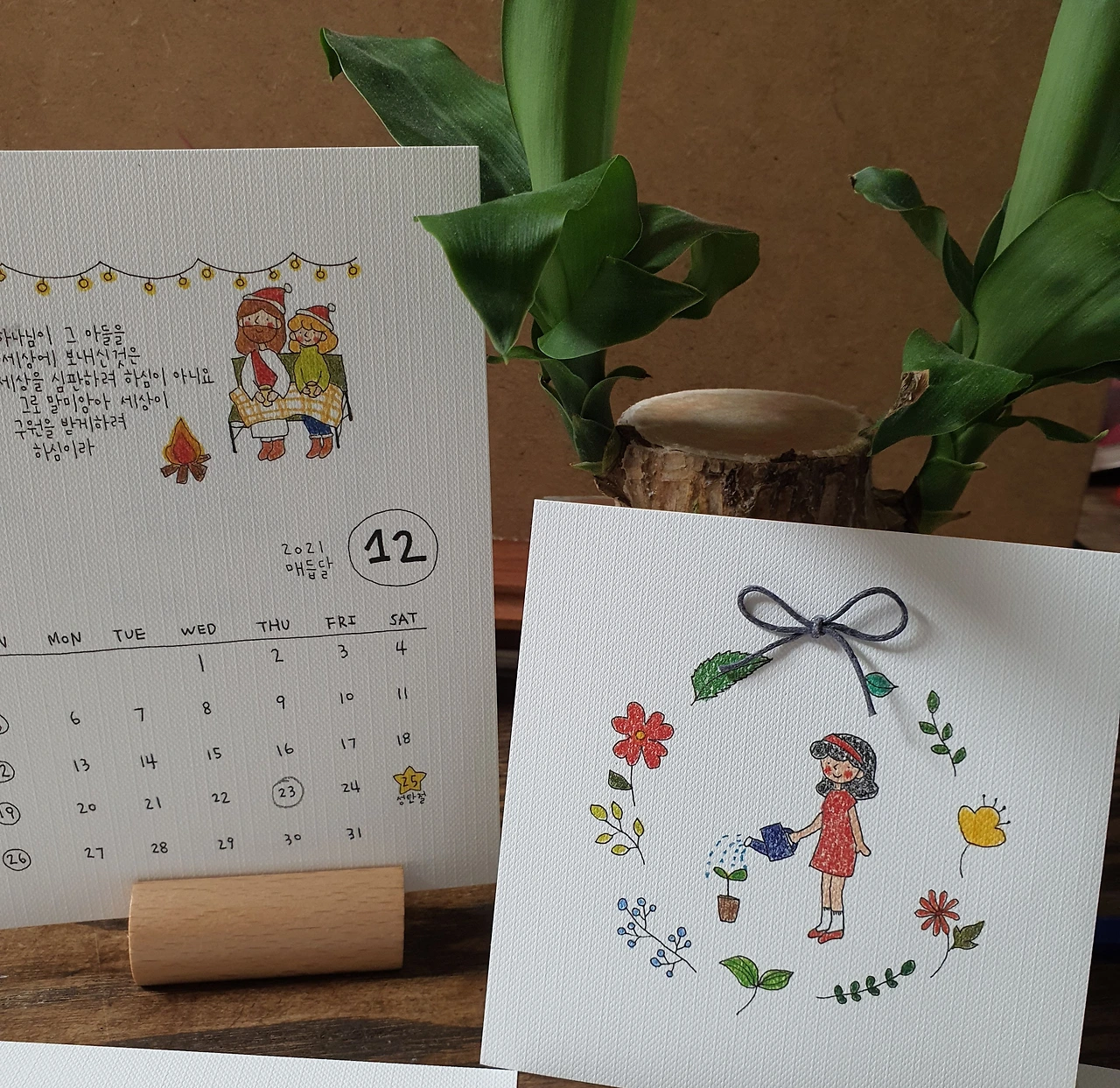 작은 책상달력인데 어찌나 사랑스럽고 아기자기한지! 손수 쓴 편지와 정감 있는 엽서까지 나 또한 책상 위에 놓고 그저 바라보기만 해도 기분이 절로 좋아진다. 마법 달력임에 틀림없어!