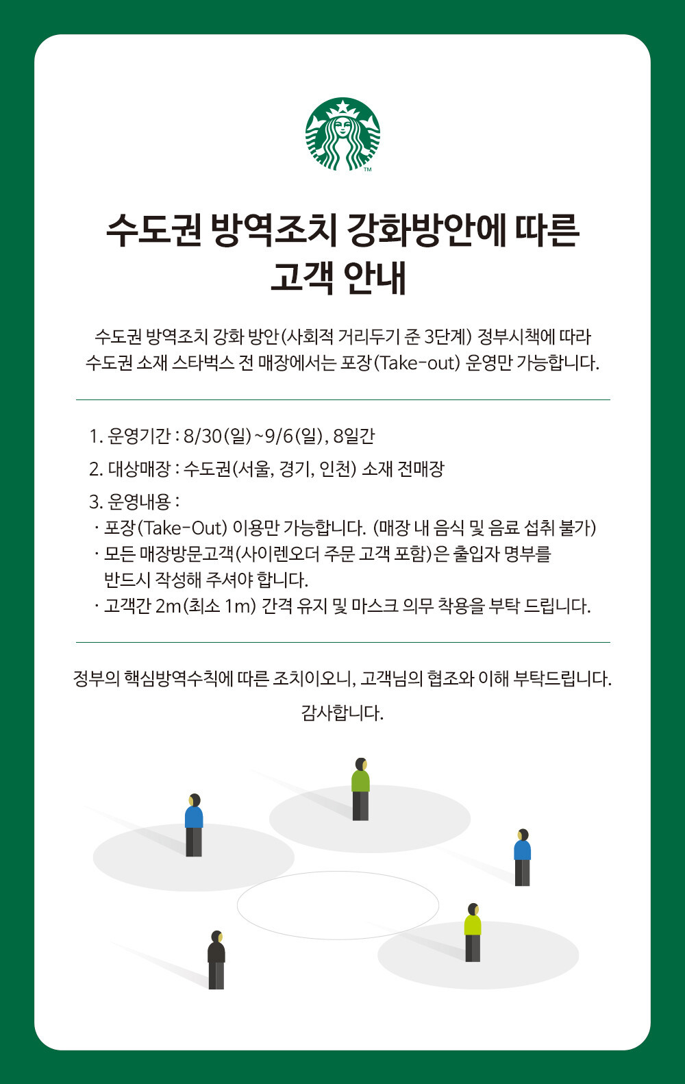 한국도 최근 감염자가 갑자기 늘어나면서 스타벅스 매장이 한시적으로 테이크아웃 전용으로 운영된다는 소식을 들었습니다. 카페에서 사람들을 만나 수다 떠는 소소한 일상이 힘들어진 안타까운 상황이지만 매장 내에서 항시 마스크 착용이 어려운 현실에서는 어쩔 수 없어 보입니다.