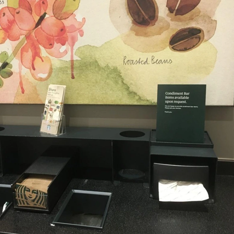매장 내 컨디먼트 바에 기본적으로 제공하던 우유, 시럽, 시나몬 등은 파트너에게 요청할 시에만 제공하고 있습니다. 또 음료 제조 시 대기하는 공간에는 사회적 거리두기에 적절한 거리를 바닥 스티커로 안내하고 있습니다.