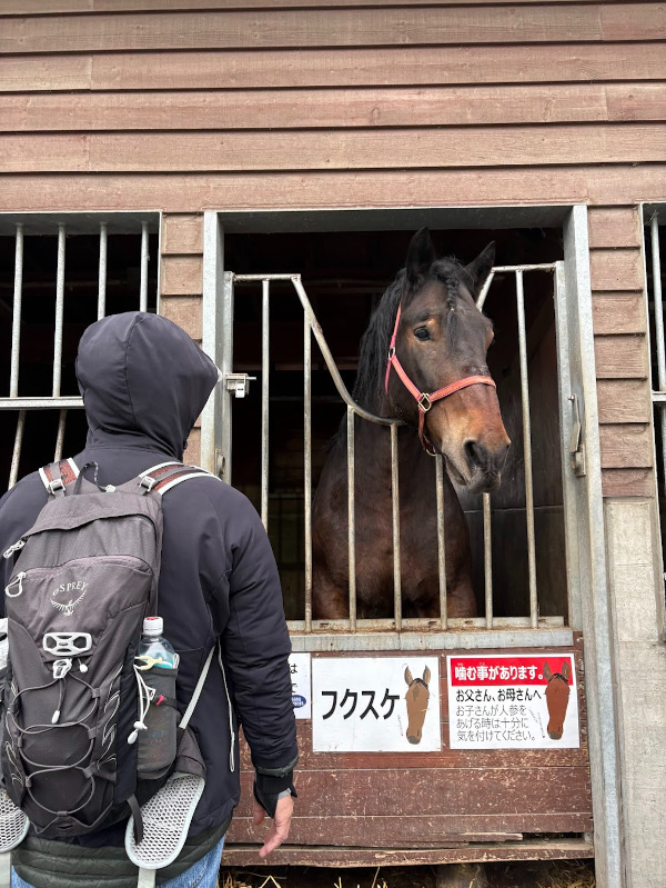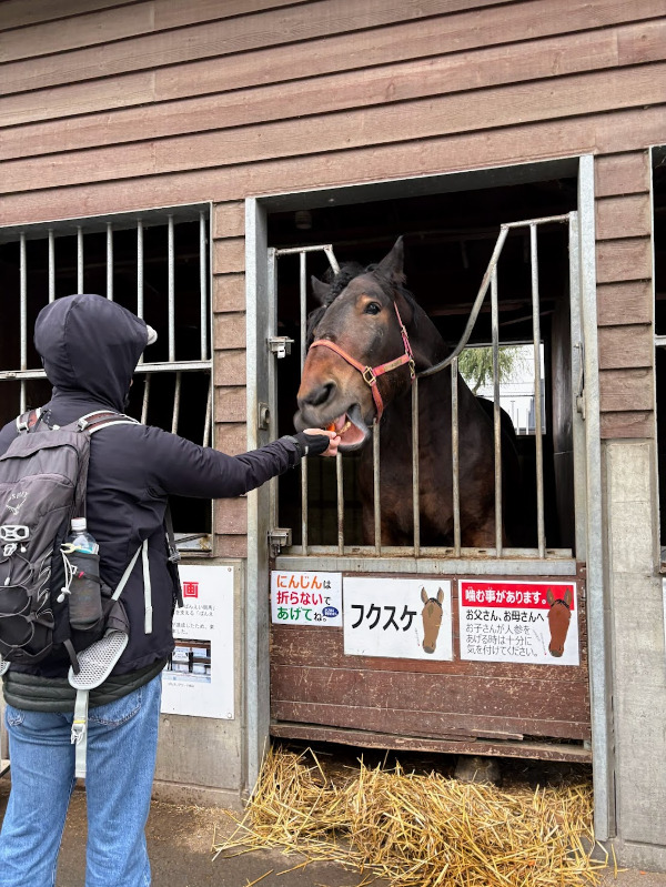 다음 경기가 시작될 때까지 마당에 있는 말들을 보러 갔다. 무슨 간식까지 주겠냐며 쿨한 척하던 남편은 어느새 당근을 두 컵째 사서 "마리짱", "후쿠스케군" 하며 이름을 부르며 먹이고 있다…?