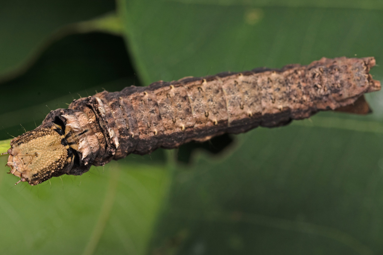 보통은 칡이나 싸리나무 잎을 먹는다고 알려진 갈고리재주나방 애벌레. 특이하게도 녀석은 예덕나무 잎자루에 떡하니 자리 잡고 있었다.