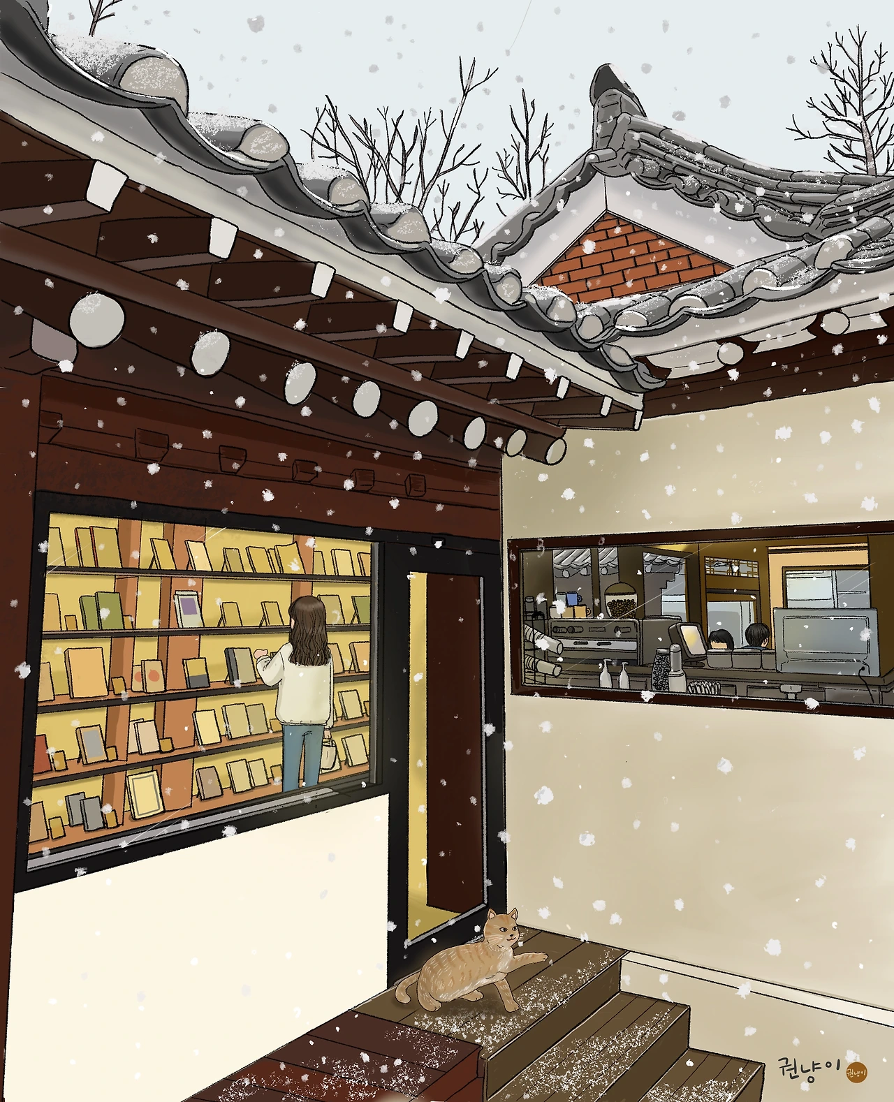 앞마당의 감나무, 뒷마당의 배롱나무, 꽃 대나무 등 아기자기 꾸며진 공간들에 앉아있으면 절로 건강해질 것 같은 공간이랄까? 나도 한가득 찍어왔음에도 서점 측에서 보내주신 눈 내리는 날 사진이 너무 좋아서 겨울의 일일호일을 그려본다.