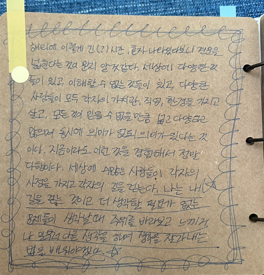 지금이라도 이런 것을 경험해서 정말 다행이다. 세상에 수많은 사람들이 각자의 사정을 가지고 각자의 길을 걷는다. 나는 내 길을 걷는 것이고 더 생각할 필요가 없는 문제들이 생각할 때 주위를 바라보고 느끼거나 일부러 다른 생각을 하며 생각을 잘라내는 법을 배워야겠다.