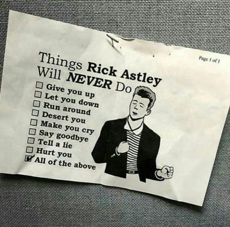 사진 하나 덕에 릭 애슬리가 밈 이후로도 여전히 네티즌 사이에서 '짤'로 인기를 끌고 있음을 알게 됐다. 오랜만에 노래도 듣고. 난 도입부를 들으면 마돈나(Madonna)의 'Holiday'가 생각나더라. 현재 이 뮤직비디오는 유튜브에서 6억 4천 4백만 이상의 조회 수를 기록하고 있다. 이거 본인 계정이니까 돈 엄청 벌었겠다.