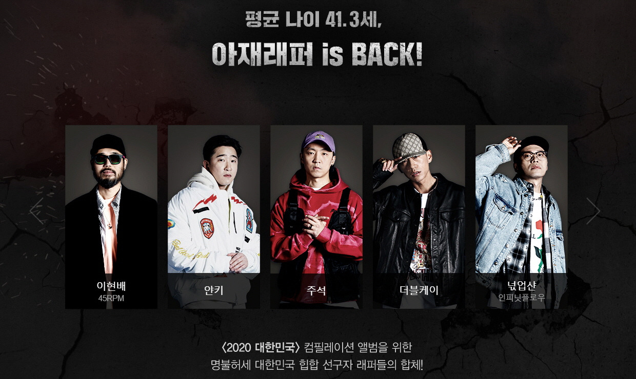 이제 그 노래는 예능의 제목이 됐다. 더불어 대선배들이 여전히 건재함을 주장하는 표어이기도 하다. 지난달 28일 첫 방송된 Mnet의 <너희가 힙합을 아느냐>는 원썬, 주석, 허니 패밀리, 45RPM 등 이른바 1세대로 통하거나 데뷔한 지 15년 이상 된 중견 래퍼 열두 명이 출연한다. 프로그램은 한국 힙합이 창성하는 데 큰 역할을 한 컴필레이션 앨범 [1999 대한민국]에 착안해 출연자들과 함께 [2020 대한민국] 음반을 제작하는 것을 목표로 정했다. 계획을 달성하는 과정을 통해 노장들의 탁월한 실력도 선전해 줄 것이다.