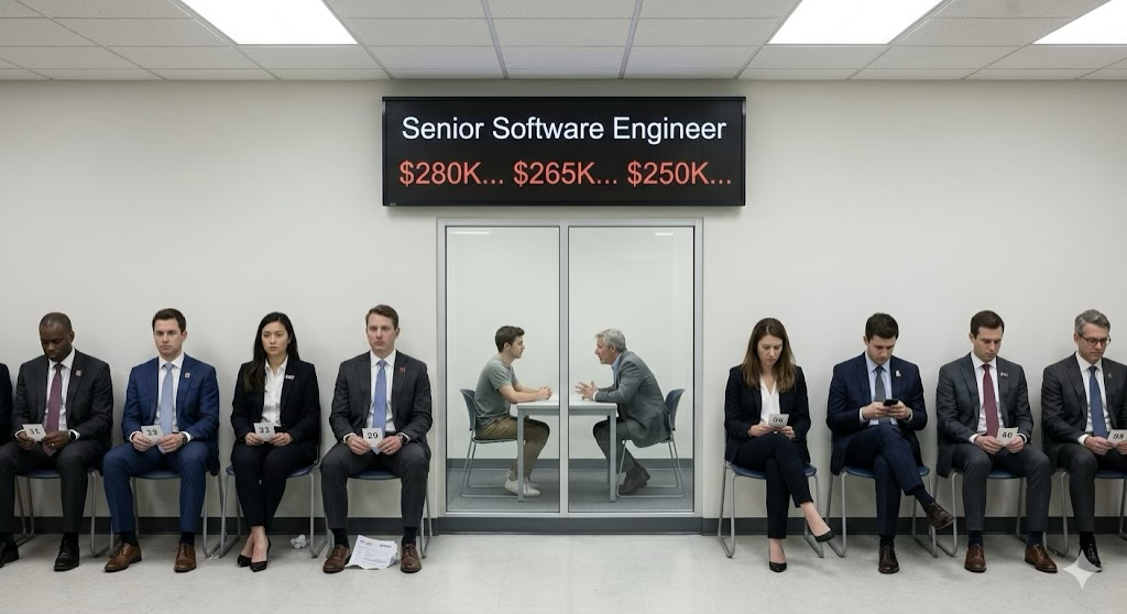 “베이 에어리어에서 연 30만 달러를 받던 유망한 엔지니어 철수는, AI 혁신이 빠르게 반영되는 좋은 회사에 몸담았던 이유로 최근 갑작스럽게 해고되었다. 다른 곳 가지 뭐 하고 즉시 주변 친구들을 통해 구직을 알아보지만, 철수 눈높이에 있던 모든 회사는 다 AI를 도입하며 인력을 줄일 계획만 있다. 몇 주를 고생하다 소름 돋는 현실에 절망하며 급히 귀국하니, 그래도 네카라우당탕에선 자신의 경력을 인정해 주어 곧바로 취업을 했다. 연봉은 15만 달러로 줄었고 업무는 재미없지만, 그래도 이제 좀 한국 회사에 적응하려던 찰나인데, 몇 주 뒤 이번엔 이 회사도 인력 감축을 한단다. 불안한 맘에 다시 구직을 알아보지만, 한국도 상황이 비슷해졌다. 모든 대기업이 철수 포지션의 채용을 멈췄다는 말만 들려온다. 철수는 이제 더 낮은 포지션을 찾기 시작했다. 신입부터 퇴직자까지 수십만 경쟁자들과 경합해야 한다는 생각에, 희망 연봉을 매주 낮추며 이력서를 돌리지만, 회신은 오지 않는다.”