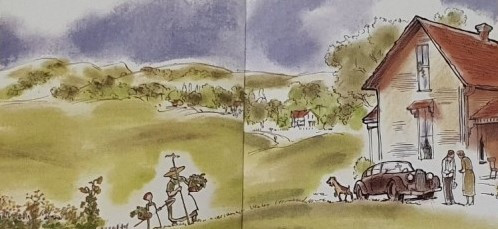 푸른 언덕 위에 띄엄띄엄 놓인 집이 고요하게 느껴진다. 자기 몸집만 한 삽을 들고 할머니 뒤를 따라가는 조그만 여자아이의 움직임이 여유롭게 보인다. 엄마와 아빠가 검은색 차 앞에서 누군가를 기다리고 있는 것 같다. 아이와 할머니의 평화로운 일상과는 대조적으로 엄마와 아빠에게서는 우울한 기운이 맴돌고 긴장감이 느껴진다.