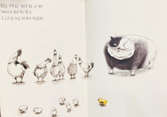 어색한 분위기 속에 니양이가 노란 병아리의 머리를 핥았다. 노란 병아리가 ‘삐약’하고 대답했다. 그래서 이 노란 병아리는 ‘삐약이’가 되었다.