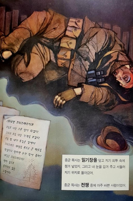 이 이야기는 1914년 스무 살이었던 영국의 오웬 데이비스의 실화다. 전쟁은 소소한 일상을 파괴한다. 개인의 의지와 결정은 없다. 아군과 적군으로 나뉜 집단 속에 명령만 있을 뿐이다. 사랑으로 모든 것을 품어주는 크리스마스라는 시간이 전쟁의 냉혹한 현실 속에서 일상을 살고 싶어 하는 사람들의 모습을 그대로 보여주었다.