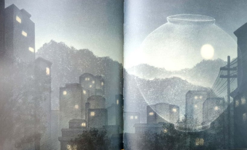 반면, 사방으로 뻗어 있는 나뭇가지가 달항아리에 비친 모습은 마치 달항아리에 금이 간 것 같다. 이 균열은 전쟁 이후의 시련을 극복하면서 억척스럽게 살아가는 삶을 표현한 것 같다. 또, 아파트 위에 떠 있는 달을 투영한 달항아리의 모습은 산업화와 도시화된 시대의 모습을 표현한 것 같다.