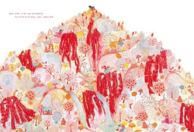 다섯 번째는 호랑이가 폭포수가 흘러대는 산꼭대기에 올라가 있는 그림은 정선의 <금강내산>과 김홍도의 <구룡연>에서 모티브를 가져왔다. 그런데 그림책의 이 그림은 비단 두 개의 한국화가 아니더라도 다른 산수화에서 많이 보았던 느낌이다. 우리나라의 산의 모습과 호랑이의 조화는 모두 한국적이어서 익숙한 느낌이 있는 것 같다. 게다가 부드러운 빨간 산등성이 위에 검은색 호랑이는 더 위엄 있게 느껴졌다.