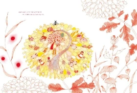 첫 번째로는 꿀벌이 사는 치마인 국화를 보면 신사임당의 <국화>가 떠오른다. 작가는 신사임당의 <국화>에서 국화 꽃잎을 표현한 방식이 현대적인 감각으로 봐도 디자인적으로 훌륭하게 다가와서 이 그림에서 모티브를 얻어왔다고 한다. 그 꽃잎을 표현한 방식이 그림책에도 그대로 표현되어 있다. 그 노란 꽃잎 하나하나의 국화꽃이 따뜻하게 꿀벌을 품어주고 있는 것 같다.