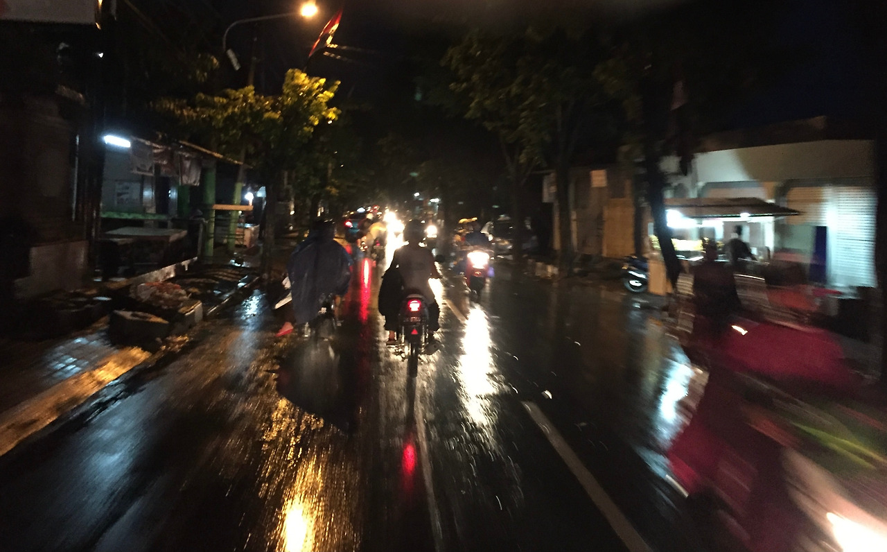 원래 텐덤을 하면 아무 생각 없이 주변 구경을 더 잘 할 수 있지만, 비가 많이 와서 운전하는 친구가 폰 내비게이션을 볼 수 없었다. 뒤에 탄 채로 계속 길을 알려줘야 했다. 그날은 거의 같이 운전을 한 셈이었다. 한국에서 사간 비닐 우비는 거센 비를 이겨낼 수 없어서, 작은 슈퍼에서 현지인들이 입는 두꺼운 판초 우의를 샀다. 새로산 비옷은 찐 라이더용이었기 때문에 바이크를 타는 그림이 그려져 있었고, 앞뒤로 안전하게 반사판까지 달려 있었다. 최고의 비옷이었다. 그 비옷은 결국 나와 산티아고 순례길까지 함께 하게 된다. 버려야 했을 때 비옷에 담긴 추억들 때문에 많이 아쉬웠다. 배수가 잘되지 않는지 엄청난 웅덩이를 지나고, 어마어마한 교통체증까지 겪으면서 해가 지고 나서야 꾸따에 도착했다. 그날 밤 티본스테이크를 먹었는데, 말도 안 되는 저렴한 가격도 충격적이었지만, 너무 맛있었다.