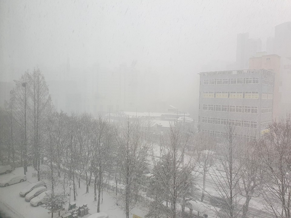 큰 눈이 내리는 희뿌연 도시. 먼 고층 아파트는 보이지 않고 가깝고 적당히 높은 것들만 눈에 보인다. 21.1.12