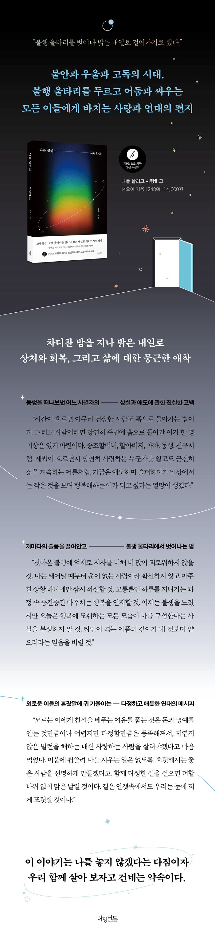제9회 브런치북 출판 프로젝트 대상 수상작인 현요아 작가의 《나를 살리고 사랑하고》가 출간됐다. 이 책은 가족의 죽음으로 자살 사별자가 된 한 사람이 자신을 둘러싼 불행 울타리를 벗어나는 과정을 섬세하게 그려 낸 이야기이다. 금기시되는 죽음 뒤에 가려진 남겨진 이의 상처와 회복에 대한 담담한 서술을 통해 개인적인 고통이 보편적인 슬픔과 울림으로 번지는 모습을 목도하게 한다.