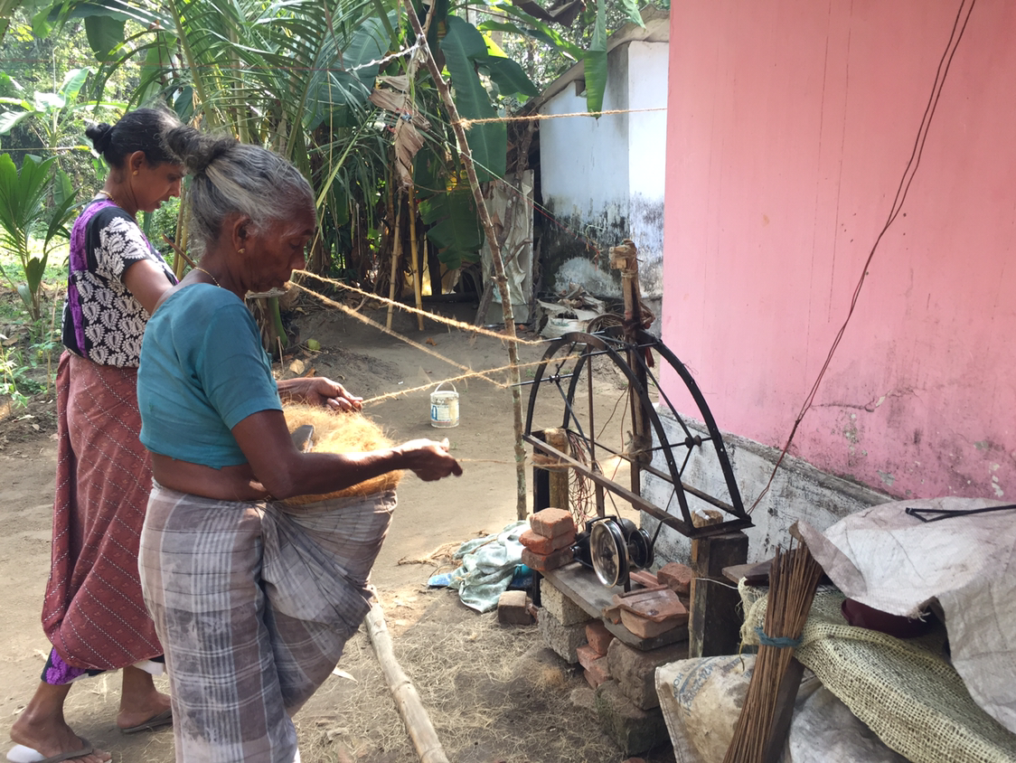 직물 기술자같지만 실은 가정주부인 아주머니들께서 직접 코코넛섬유로 실을 잣고 계세요.