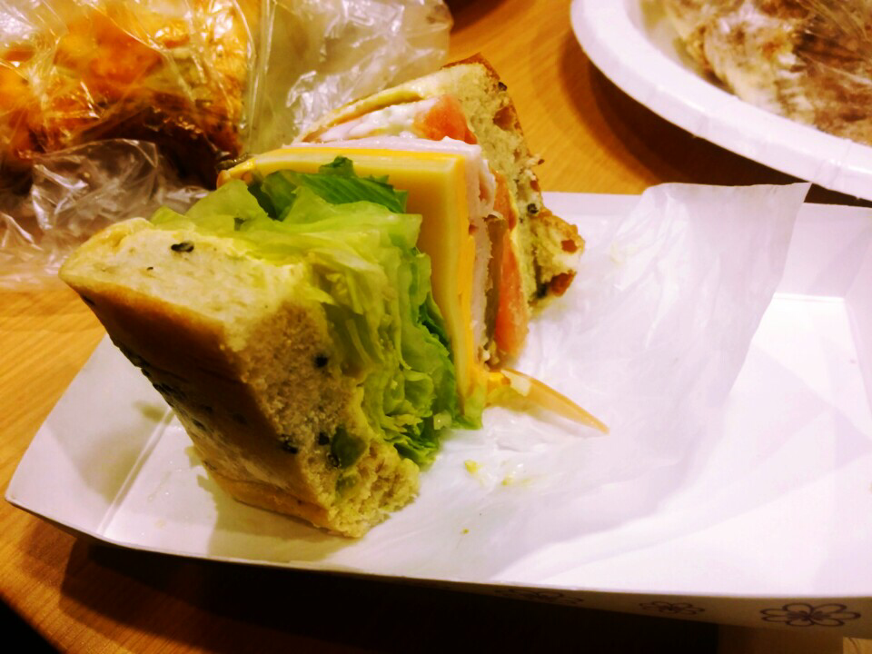 당절임한 완두가 들어간 빵. 신선한 양상추가 듬뿍!