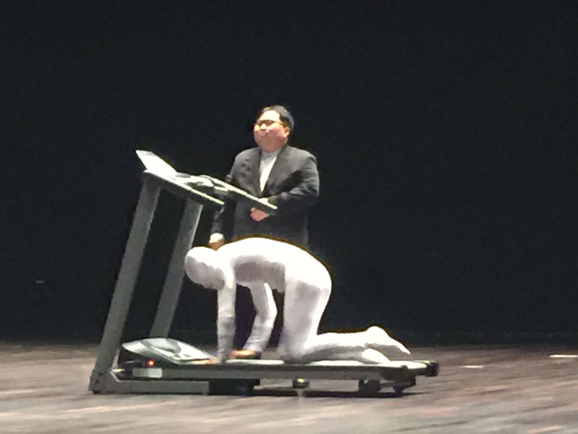 양복입은 퍼포머의 수행에 관련하여 권위적인 표정과 부연 설명없는 가속은 요새 사회에서의 갑질, 점점 어지럽고 혼돈스러워지는 엔트로피, 흔히 말하는 수저들의 불공정한 시작 등을 예표하는 듯 했다.