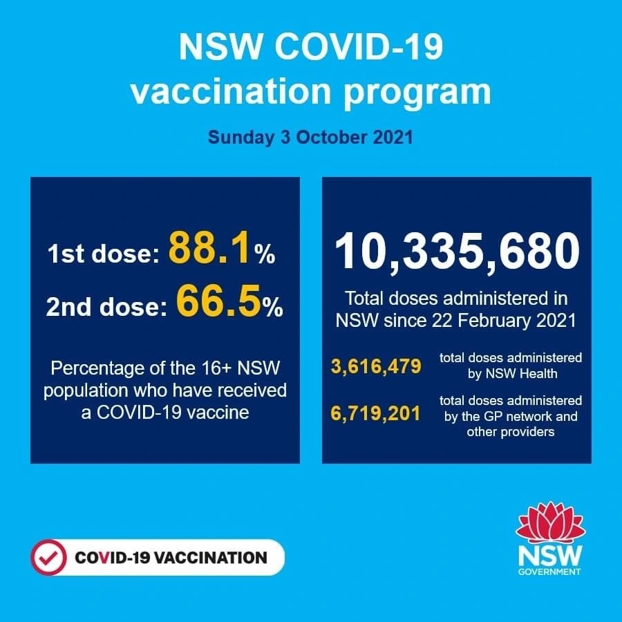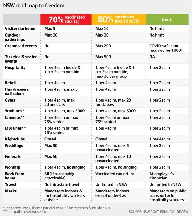 이후 80%대 접종률이 달성될 것으로 예상되는 10월 말에는 Sydney 광역권을 벗어나 NSW 주 내 모든 지역으로 왕래가 가능하고 개인거리 규제도 한층 완화되면서 대다수의 규제들이 풀리게 되지만 실내에서 여전히 실내 Mask착용은 강제조항으로 남게 된다. 그리고 90% 접종률이 달성된다는 12월부터는 대부분의 일상이 회복될 것이고 Mask 착용도 대중교통 이용과 Hospitaloty 산업 종사자들에 한에 착용으로 완화되면서 백신 미접종자의 활동 규제가 풀리게 된다. (이전 까지는 모든 규제 완화 조치는 2차 예방접종을 완료한 사람들에 한해 적용이 된다.)