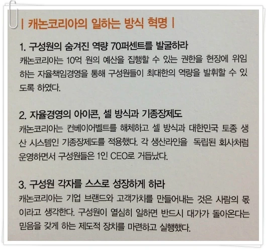 오래된 책이다. 아직도 이렇게 운영하고 있는지는 의문이다. 일본계 기업을 회사명을 밝히면서까지 자랑짓(?)에 동조하고 싶지도 않다. 이름을 지웠다. 어떤 회사인지 누구나 알 수 있다. 그래도 이름을 굳이 밝히고 싶지 않다. 다만 아직도 이렇다면, 아니 그때만 그랬다고 하더라도 좋은 케이스이다. 많은, 대부분의 회사가 이렇게 운영하지 않기 때문이다.