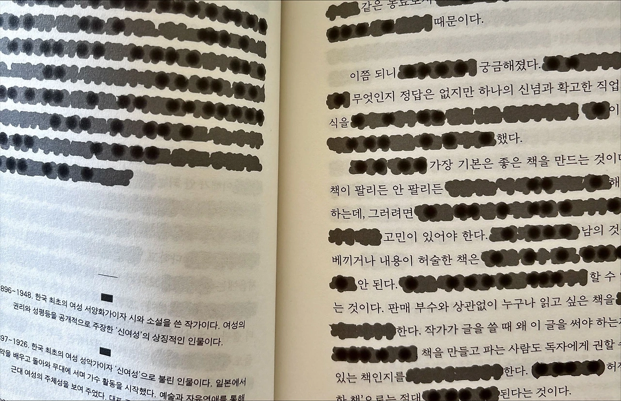 책 만드는 과정을 더 상세히 알게 되었다. ‘기획 - 원고 집필 - 편집 - 디자인 - 인쇄 - 출간 - 유통 - 홍보·마케팅’. 멀리서 보면 유유히 흐르는 출판 과정을 줌인하면 북디자이너가 ‘판면의 하단 여백을 25mm로 할 것인 지 22.6mm로 할 것인지, 첫 행 들여 쓰기는 3.35mm가 좋을지 3.3mm가 좋을지, 본문 시작을 9행부터 할 것인지 10행이 좋을지 심사숙고하고 있다. 눈이 둔한 독자는 보여도 보지 못하는 요소이다. 독자를 유혹하는 표지 디자인이나 작가의 의도를 헤아리기 좋은 글자체, 행간을 읽어 내기에 적절한 행간을 정하는 일은 앞에서 한 ‘헛된’ 숙고에 비하면 독자와 대면하는 수준의 일이다.