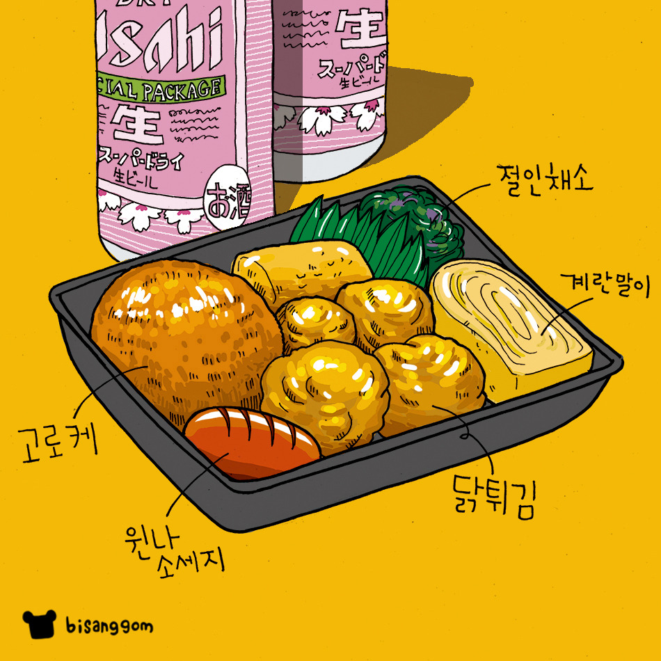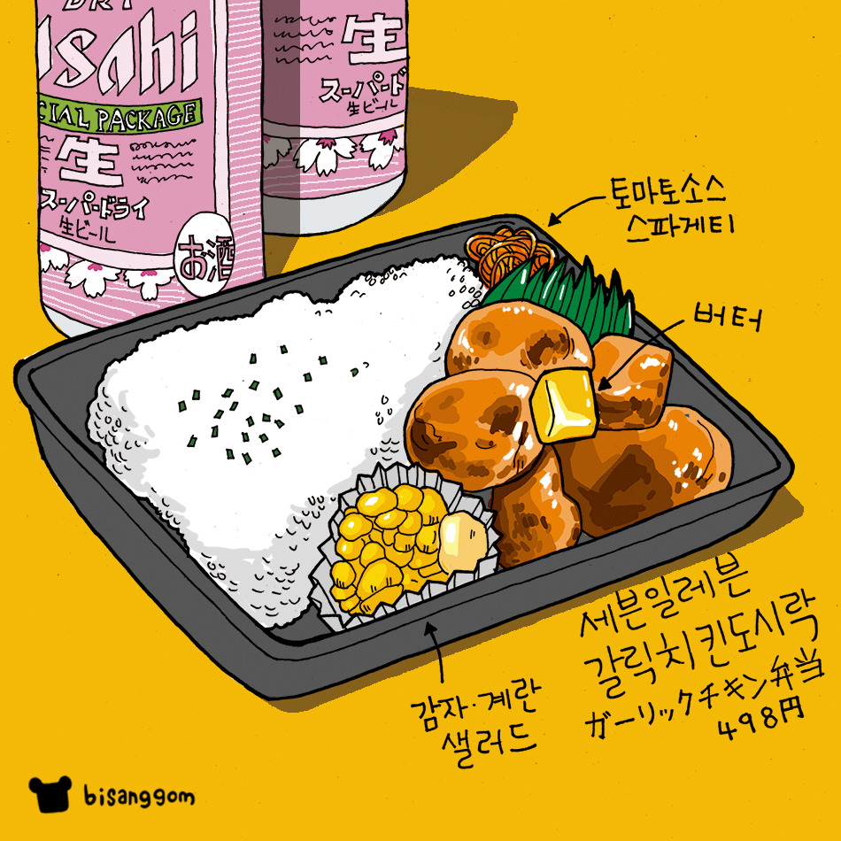 편의점에 들어가서 도시락과 맥주를 골랐어. 그때 주로 골랐던 도시락은 치킨 계열. 아무래도 맥주에는 튀긴 닭이 최고니깐.