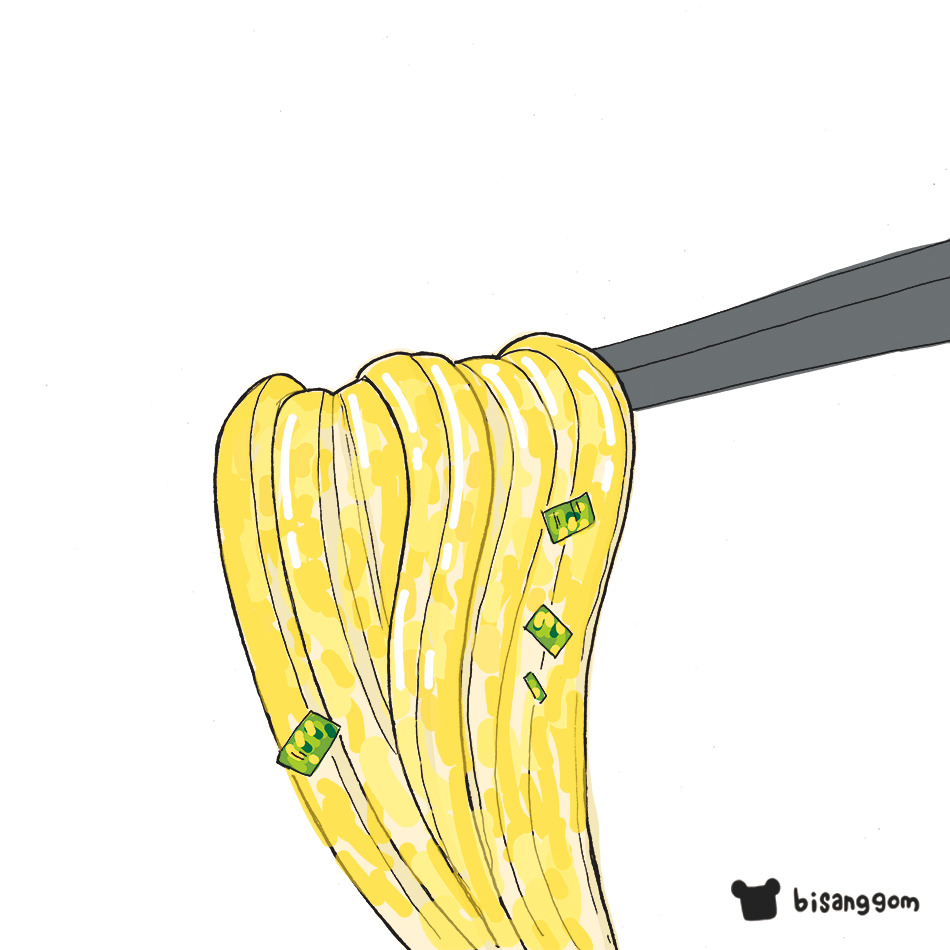 하얀 우동면이 계란 노른자와 어우러져 살짝 노랗게 보일 때까지 섞어 준다.