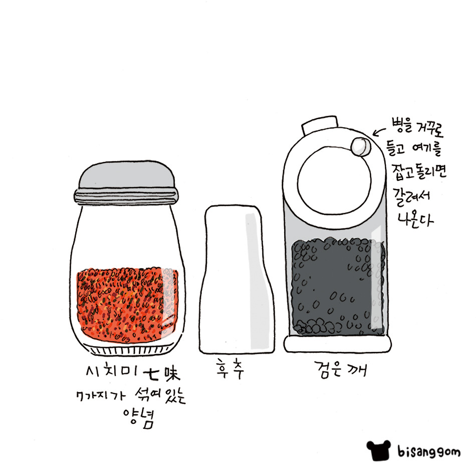 시치미 (일본 조미료)를 듬뿍 뿌리고 검은깨를 갈아서 넣는다.