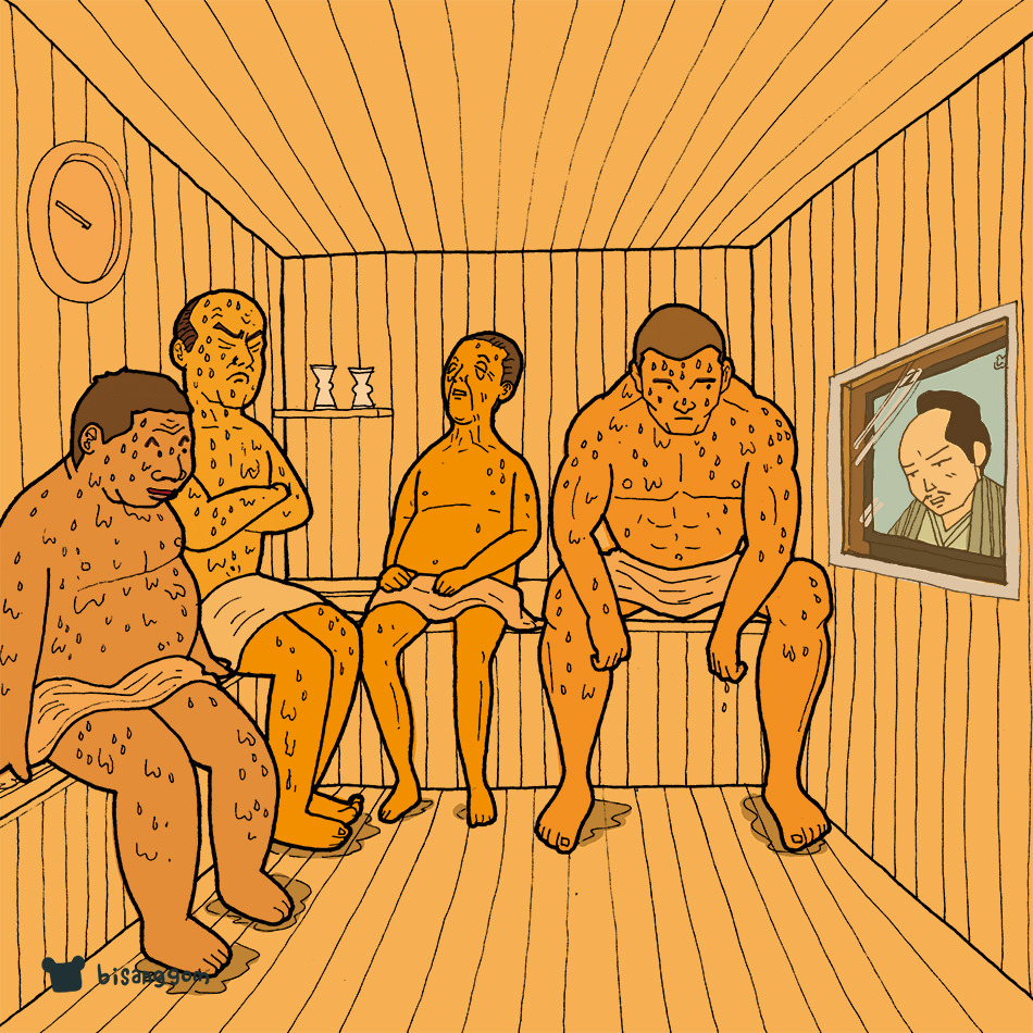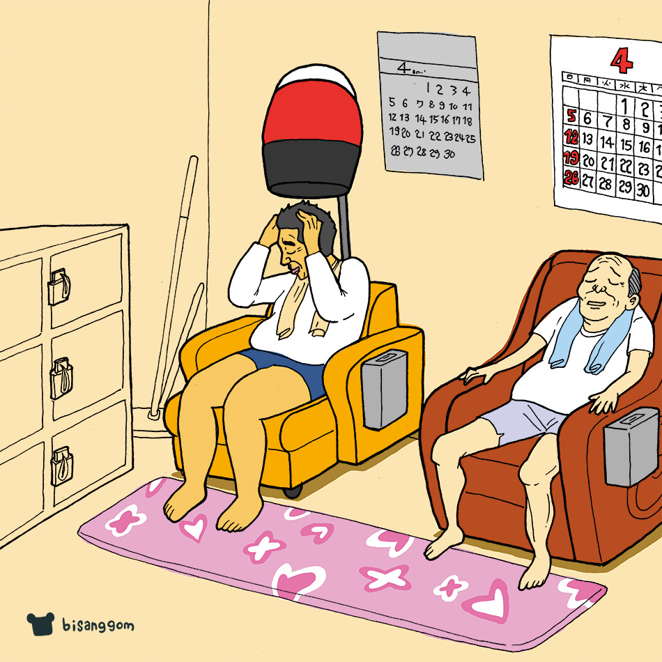 몸이 살짝 더워지면 탕에서 나온다. 기본적으로 한 곳에 오래 있지 못한다. 다음은 건식 사우나로 간다. 사우나실 안에 TV가 있다. 사우나라는 공간은 들어서는 순간 마치 시간이 정지한 듯 천천히 흘러가는 곳인데 TV에 집중하다 보면 뜨거워도 조금 더 버틸 수 있었다. 어느새 땀이 주룩주룩 흐른다. 더 이상 참을 수 없을 때 탈출하듯이 밖으로 나온다.