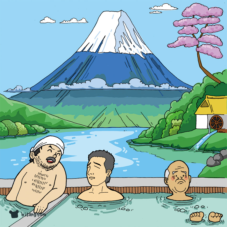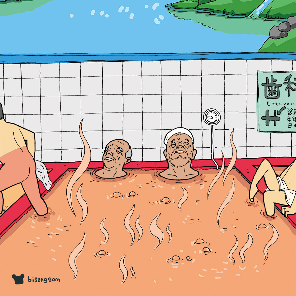 먼저 온탕에 들어간다. 이때가 기분이 제일 좋다. 온도가 42 정도 되는 것 같다. 한번에 쑥 들어가기엔 꽤 뜨겁다. 그래서 발끝부터 조금씩 조금씩 담그기 시작한다. 가슴 위까지 담그면 답답하고 열이 올라와서 반신욕을 한다. 난 이렇게 뜨거운데, 목까지 몸을 담그고 오래 있는 일본 할아버지들이 항상 신기했다.