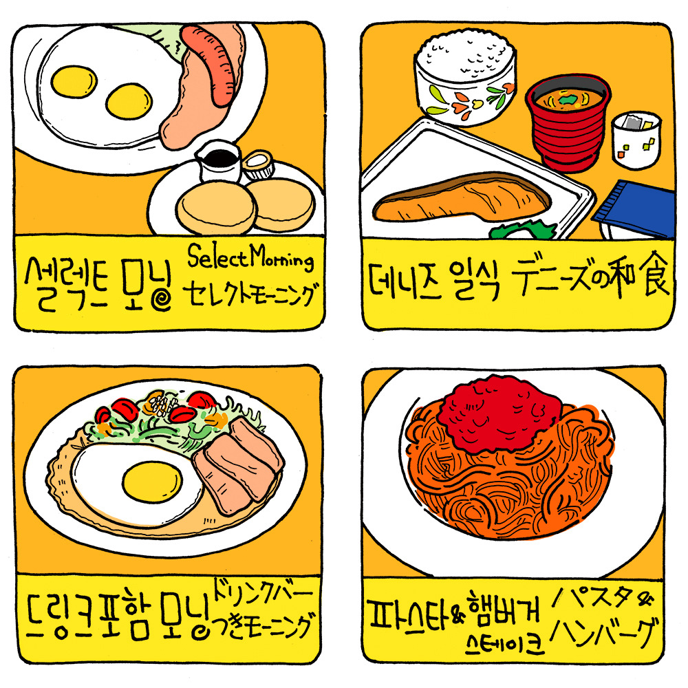 세수도 안 하고 모자만 둘러쓰고 나간다. 슬리퍼 신고 느릿느릿 레스토랑으로 향한다. 고급은 아니고 동네에 흔히 보이는 패밀리 레스토랑. 최근 근처에 데니즈가 생겨서 매우 반가웠다. 데니즈는 ‘세븐일레븐’ 홀딩스에서 운영하는 레스토랑이다.