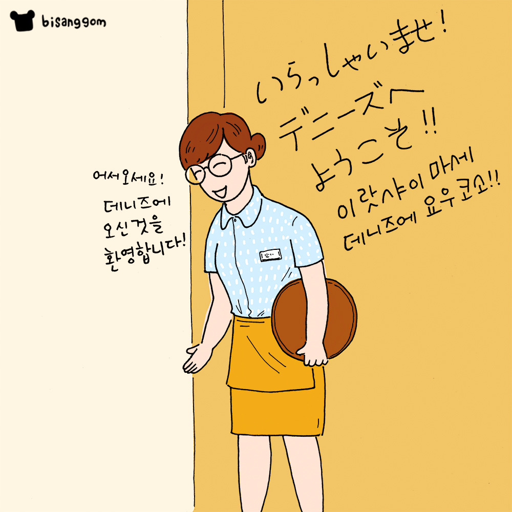 "어서 오세요. 데니스에 오신 것을 환영합니다. "(이럇아이마세. 데니스에요우코소)