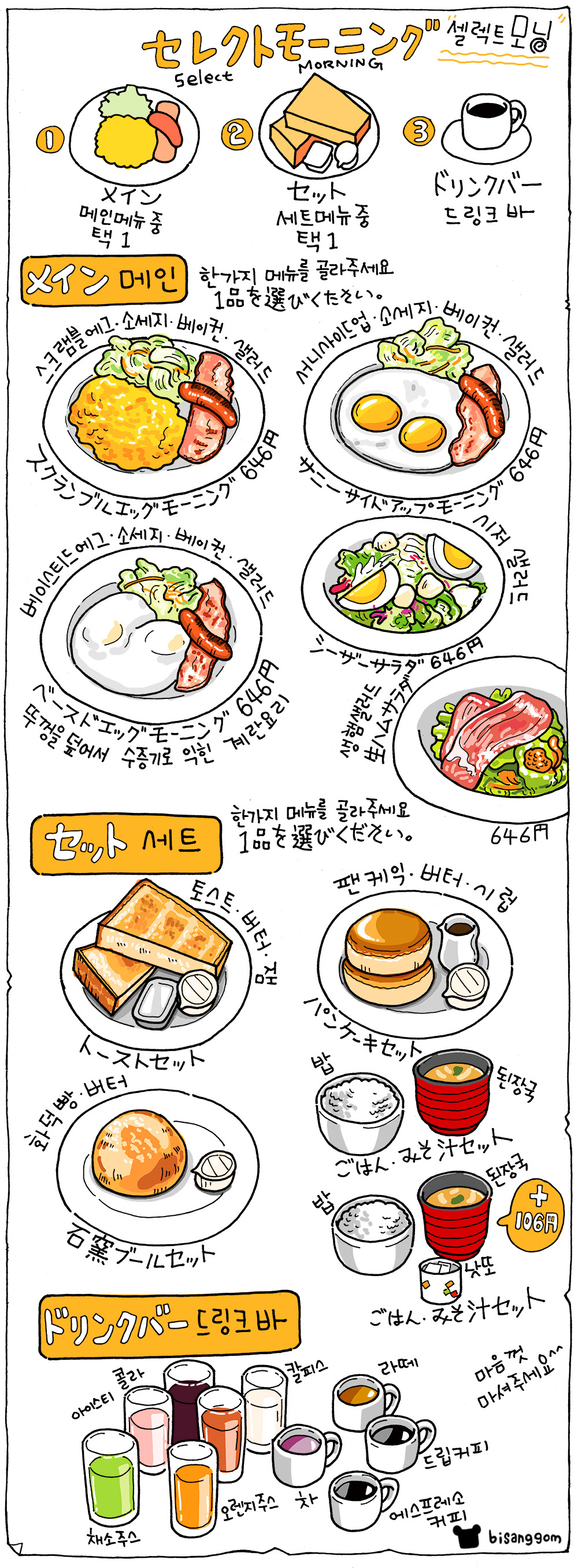 아내는 스크램블과 밥과 된장국 추가, 나는 식빵과 삶은 계란이 있는 토스트 세트를 주문했다.모닝세트에는 드링크바가 기본으로 포함되어 있다. 드링크바에서는 커피, 차, 주스, 탄산음료 등을 마음껏 마실 수 있다. (드링크바가 없는 매장도 있음)