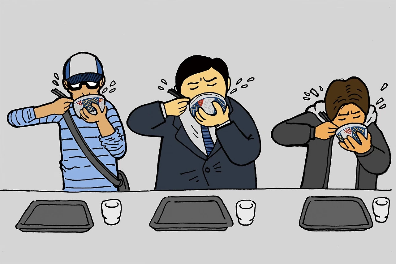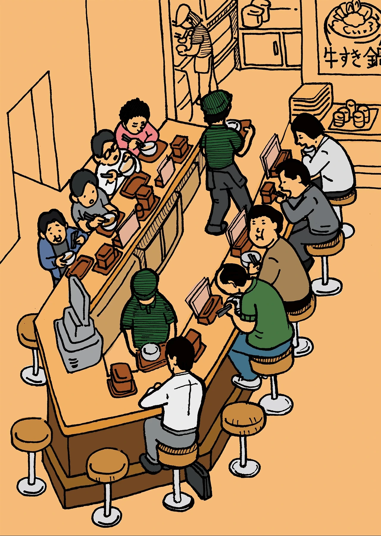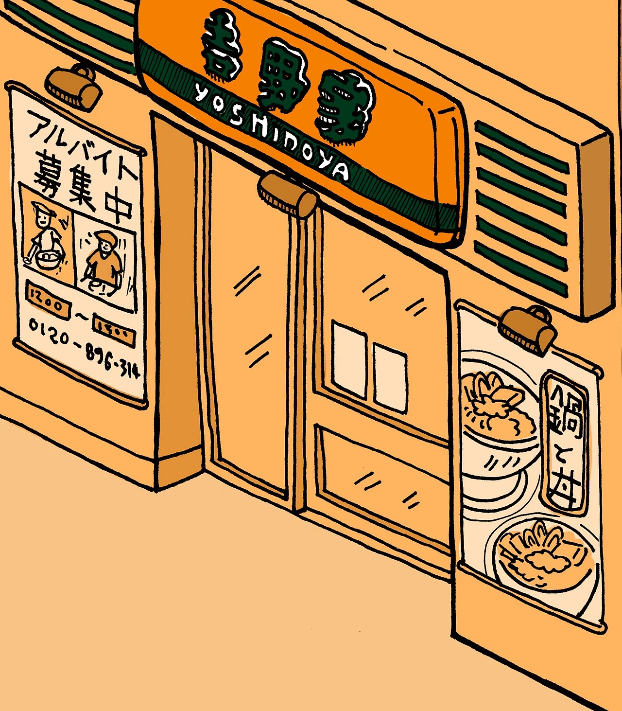 요시노야의 베테랑 단골들이 매장에 입장합니다.