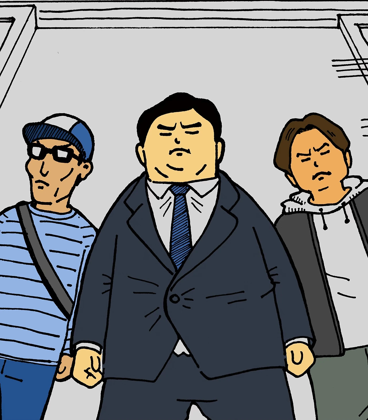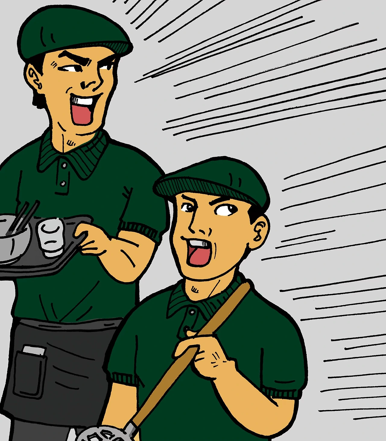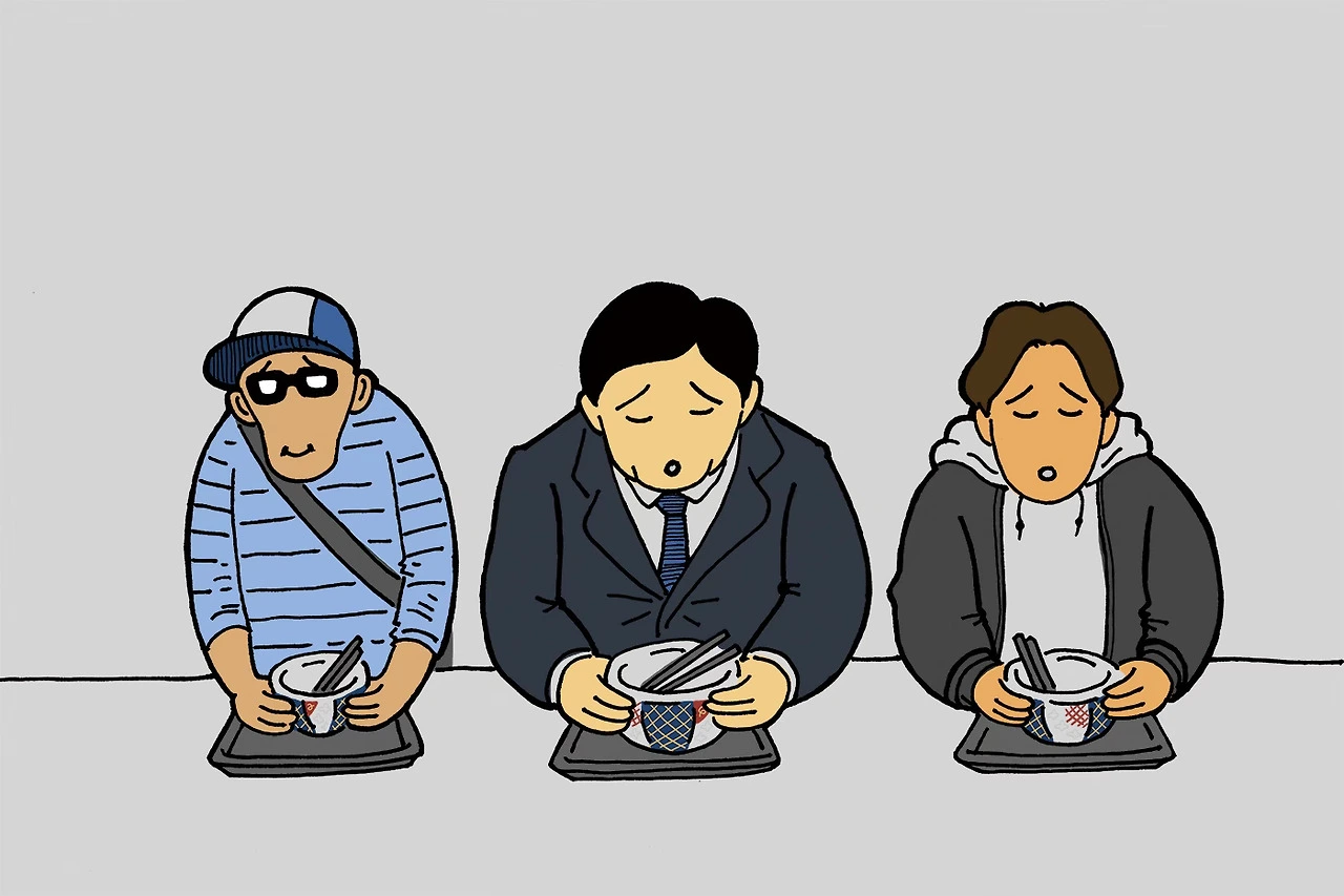 요시노야의 베테랑 단골들이 매장에 입장합니다.