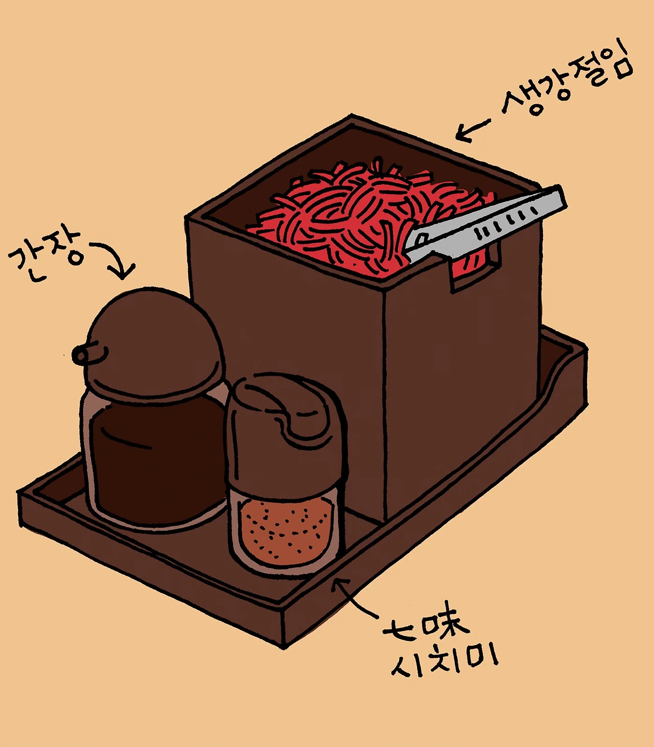 빨간 생강절임을 규동 위에 얹고 시치미를 뿌리고 식사시작.